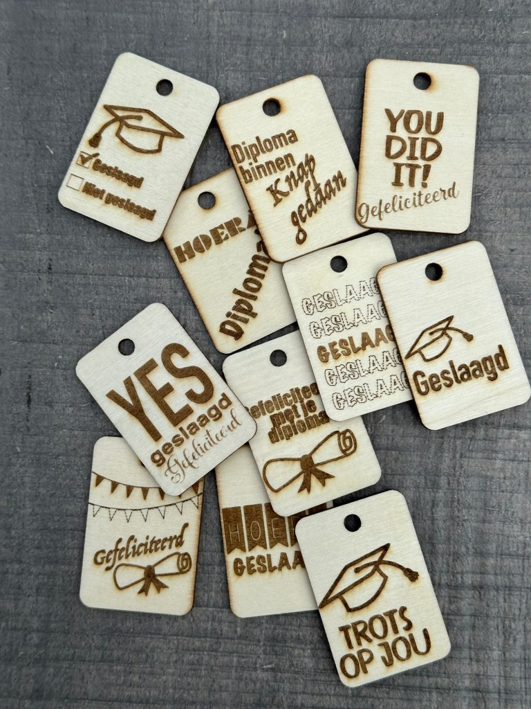 Vele vlaggen hangen uit, feestjes worden gepland en cadeautjes worden gekocht. Maak ze extra leuk met een gepersonaliseerde ‘geslaagd’ houten label. Ik heb er een aantal gemaakt maar suggesties zijn welkom. Als ze zo leuk zijn voeg ik ze aan de bestellijst toe.