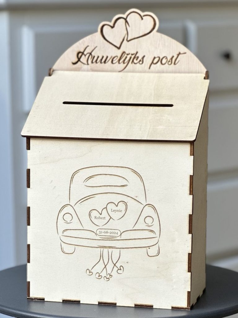 De brievenbus kan ik aanpassen op vele manieren zodat het voor verschillende gelegenheden te gebruiken is. Uitermate geschikt voor een bruiloft om de ‘Huwelijkspost’ (€€€ 😉) in te ontvangen. Op de voorkant kunnen de namen van het bruidspaar met een mooi plaatje of iets wat op de bruiloft-uitnodiging staat. Aan de bovenkant kan de vorm aangepast worden aan de tekst die erop komt.