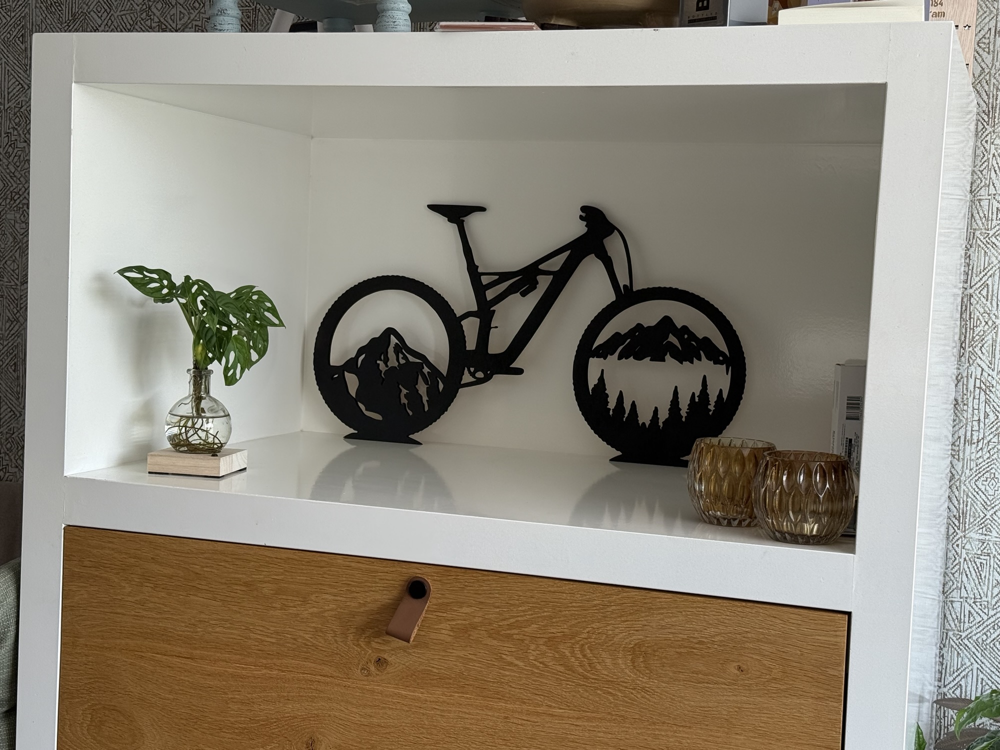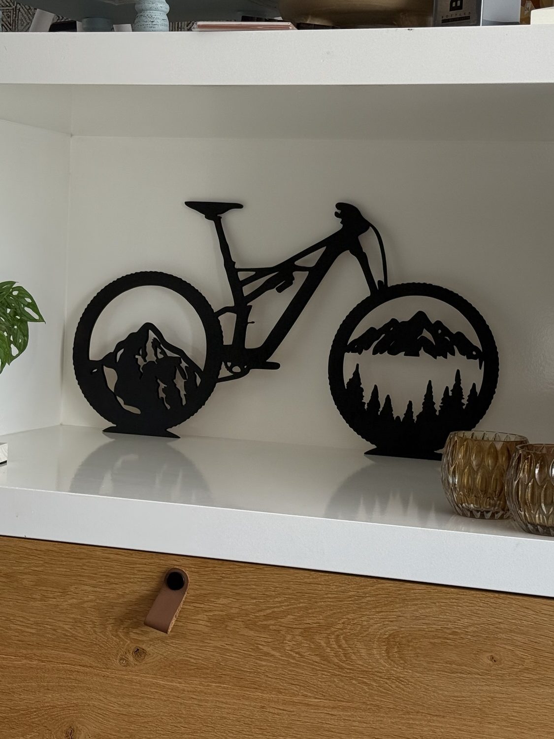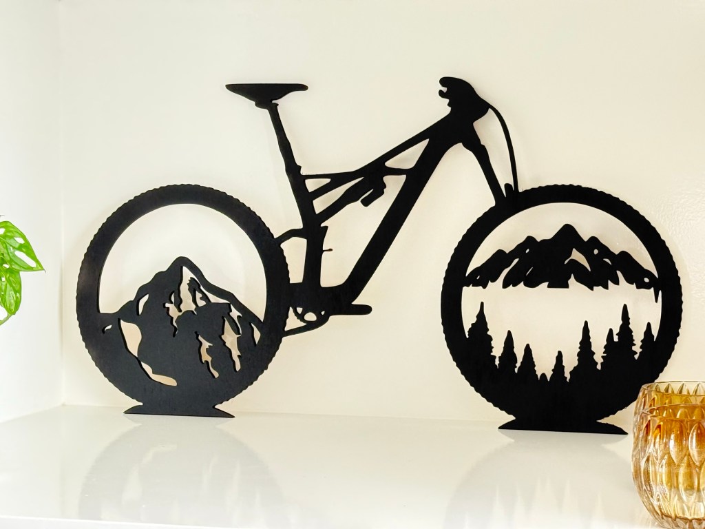 Deze toffe MTB fiets is gemaakt van 8mm dik hout en staat prachtig aan de muur of in de kast. Hij is 65cm breed en 35cm hoog. Dit voorbeeld is strak zwart maar kan in vele andere kleuren zoals wit, roze, goud, blauw, groen, geel of iets anders wat jij leuk vind.