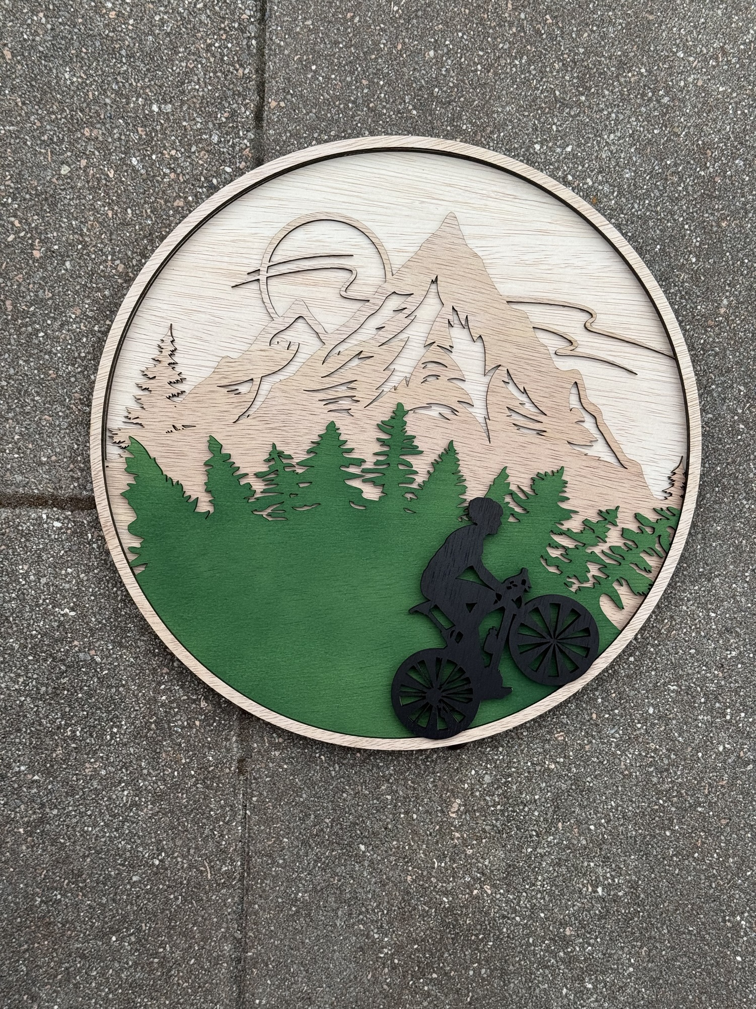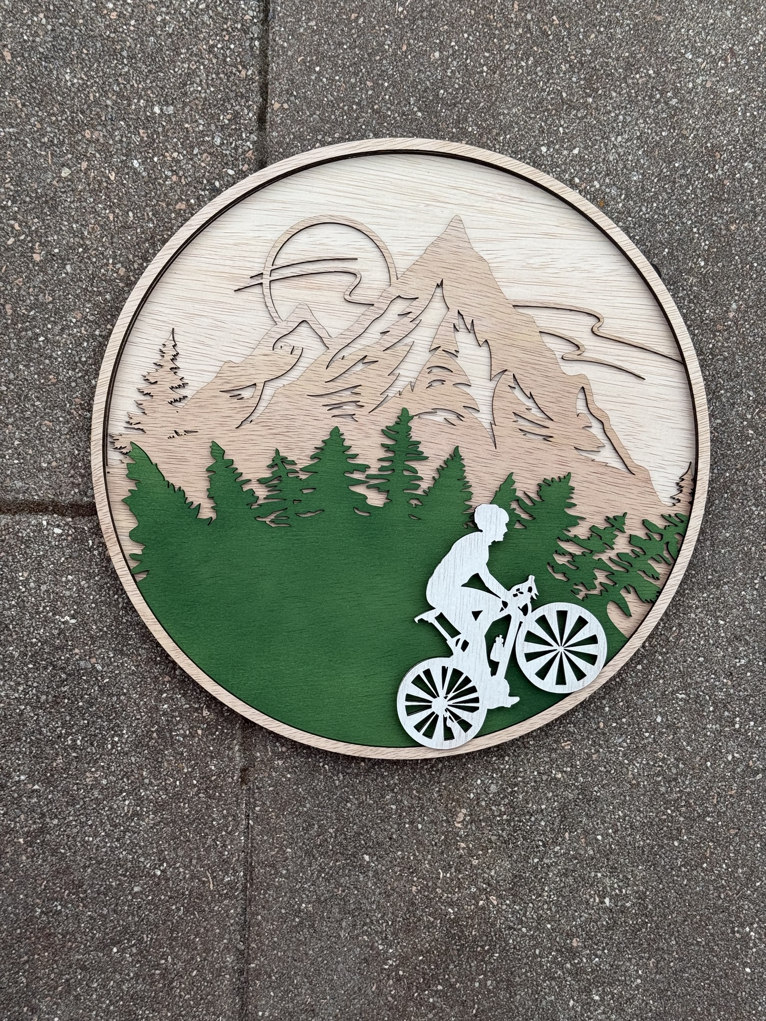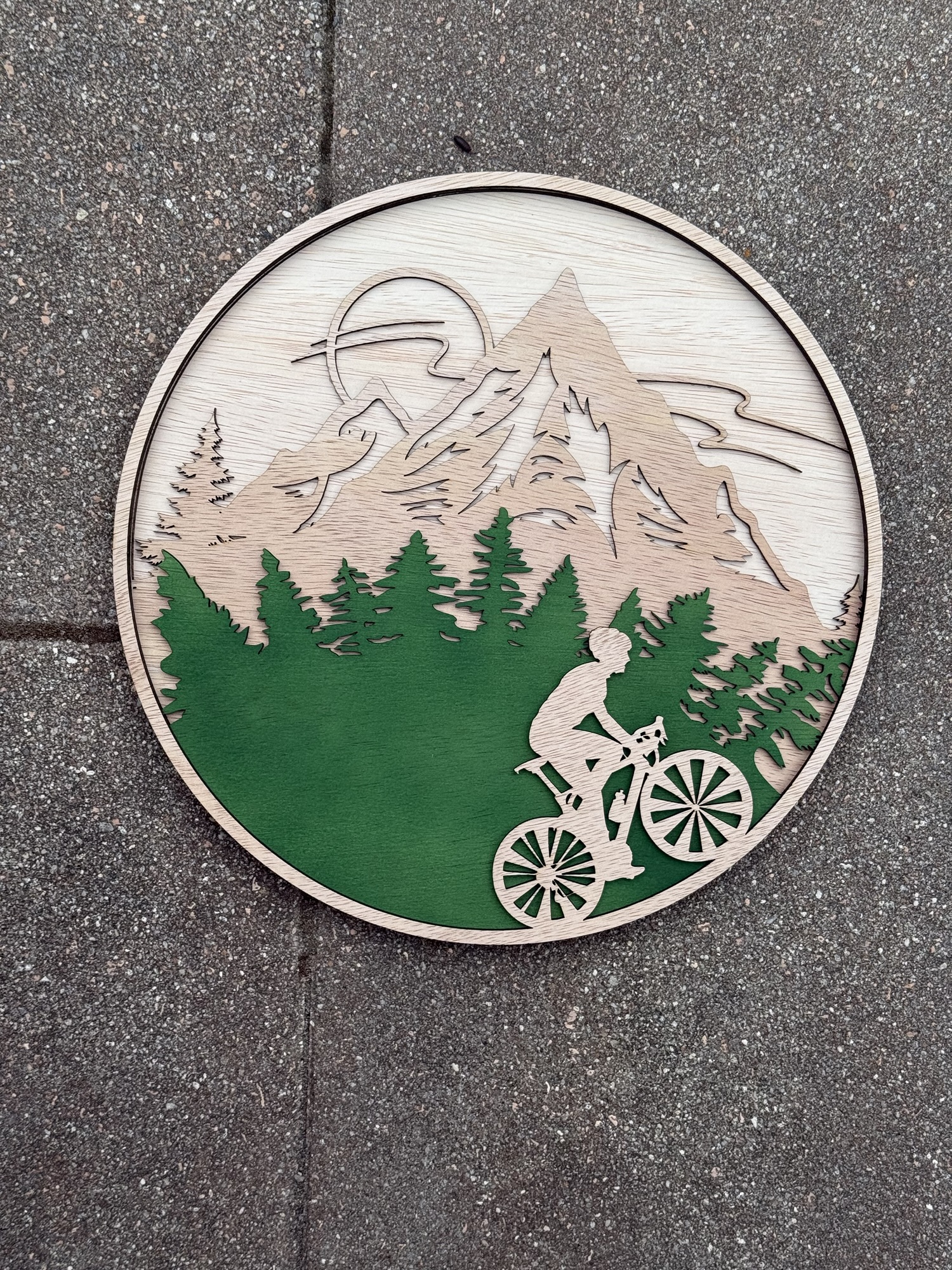 Ronde plank van 30cm met een bergtijger! De fietser kan ik vele kleuren gespoten worden.