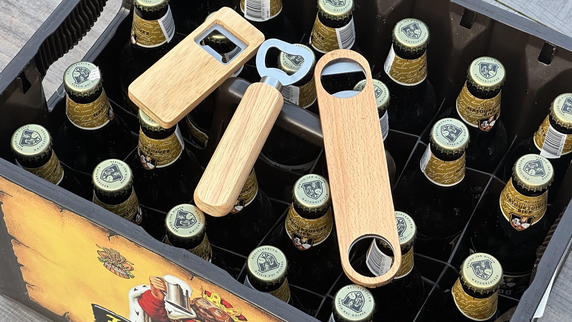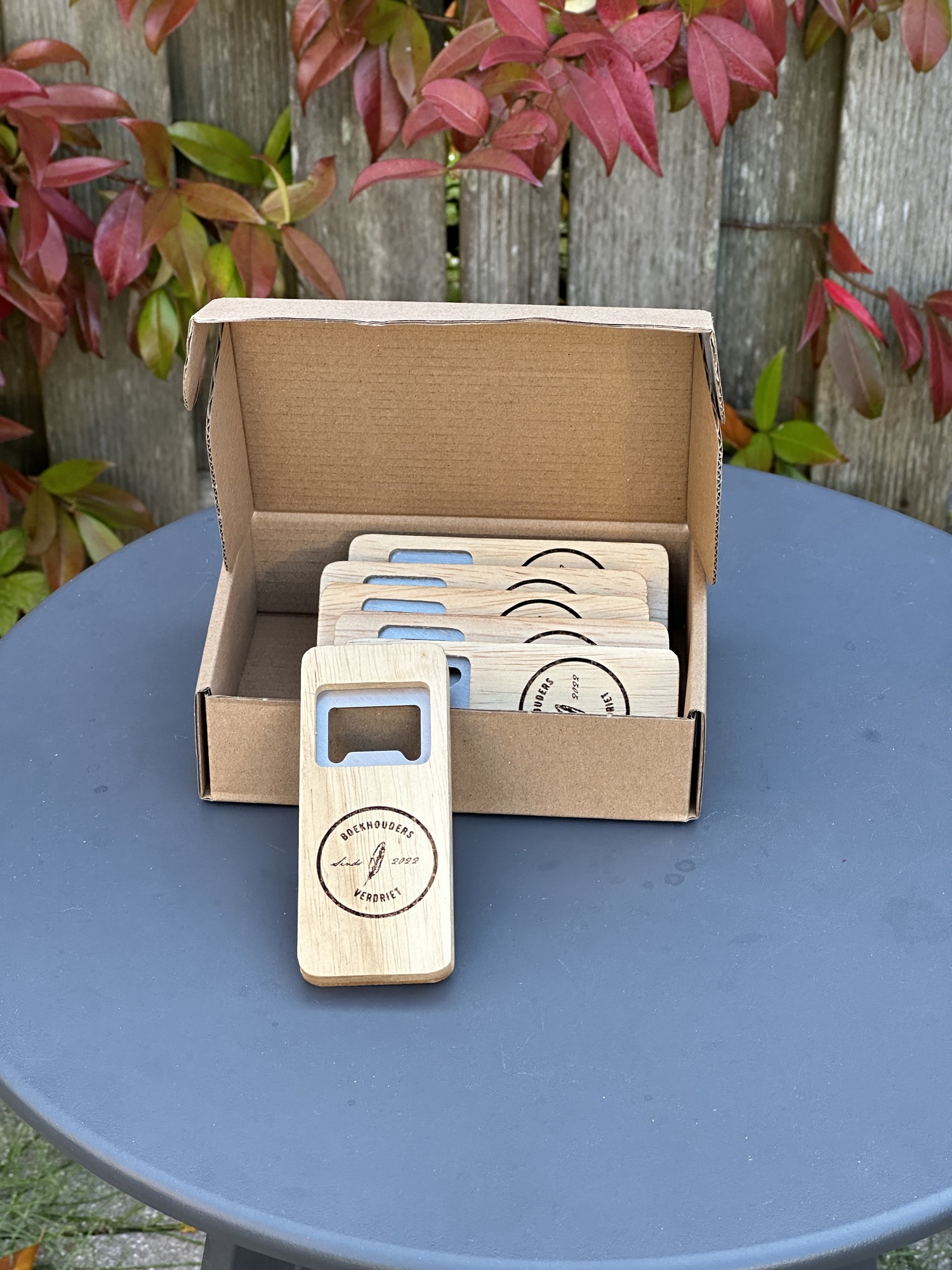 Een mooie stijlvolle flesopener (rechts op de foto)! Deze stevige flesopener heeft veel ruimte om iets op te graveren zoals logo’s, spreuken of teksten. Aan beide kanten!