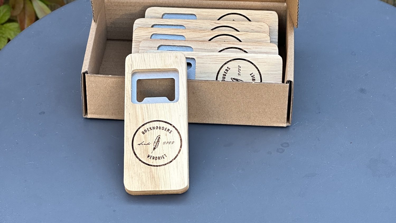 Erg geschikt om er een logo op te graveren en op de achterkant een tekst of bedankje.