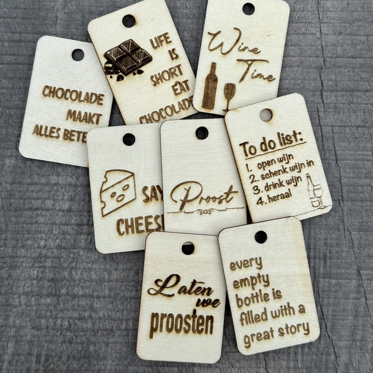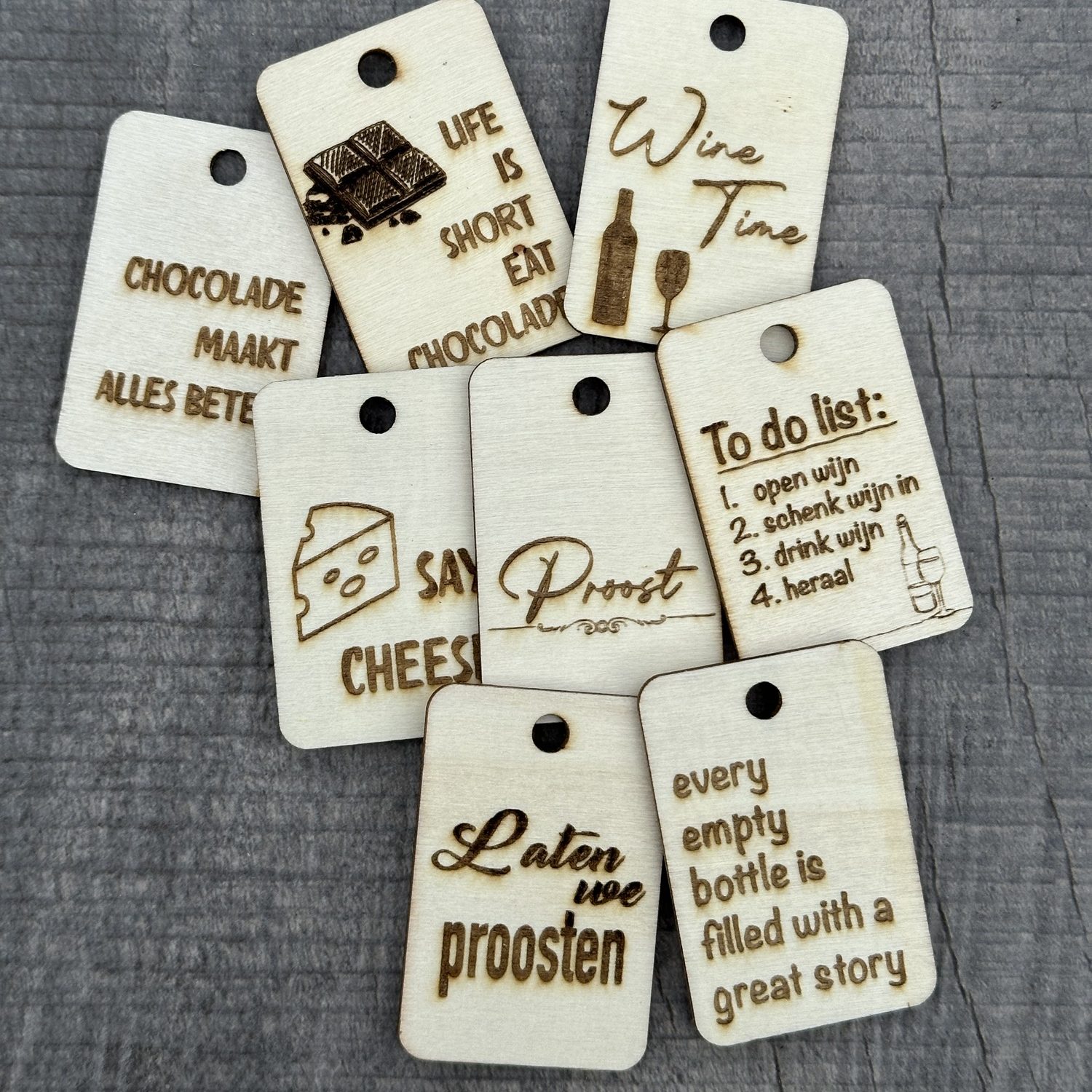 Ondertussen zijn er meer dan 100 verschillende labels waaruit je kunt kiezen. Daarom zijn ze verdeelt in verschillende categorieën waardoor je makkelijk te beste labels kunt vinden. Bijvoorbeeld ‘Felicitatie‘, ‘Borrel/Eten‘, ‘Enkhuizen‘ en ‘Gewoon‘. Met een houten label maak je ieder geschenk leuker.
