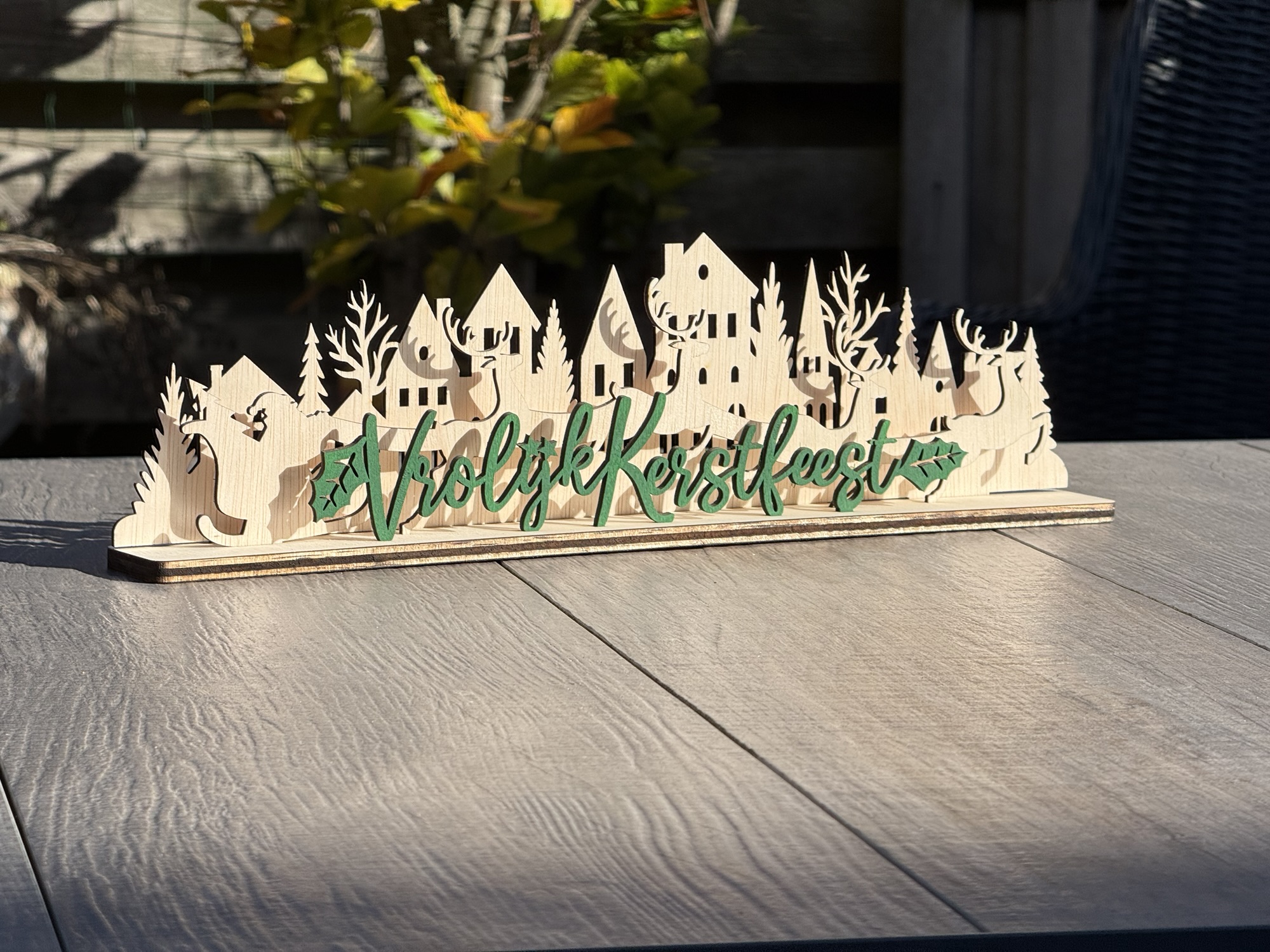 40cm breed en 12cm hoog. Je kan kiezen voor de teksten ‘Vrolijk Kerstfeest’, ‘Fijne Kerst’ en ‘Merry Christmas’. Dat kan in het rood en groen. Of liever een andere kleur? Laat in een bericht onderaan deze pagina weten wat je wil.