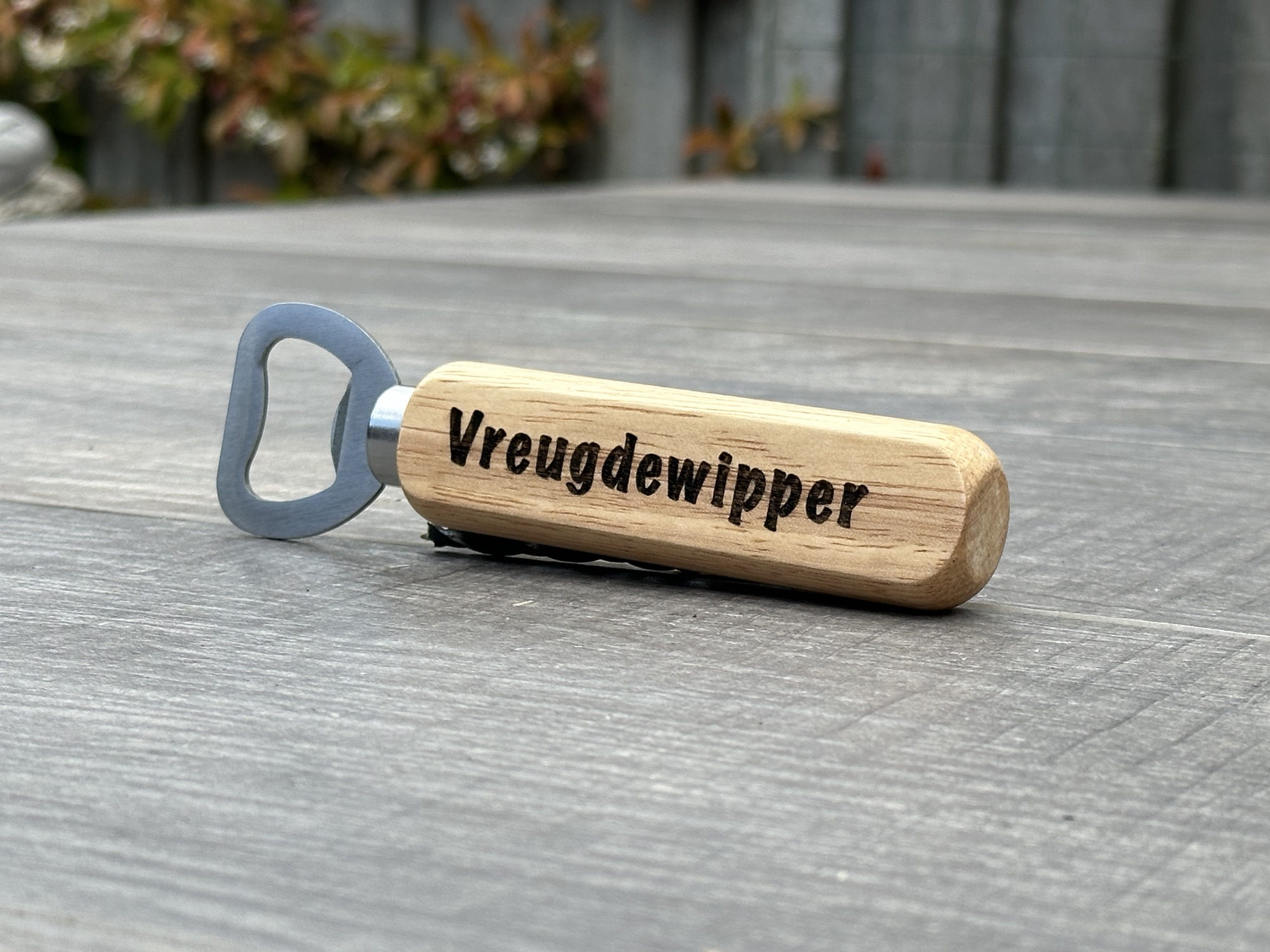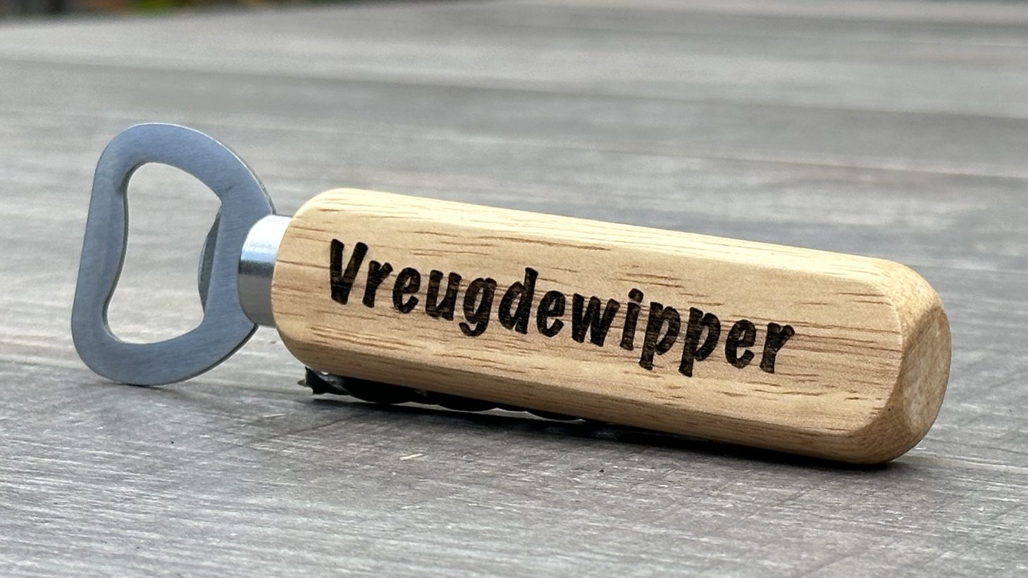 Die wijnkistjes met houtgravering zijn leuk. Maar als iemand liever bier drinkt? Kies dan de VREUGDEWIPPER! Op beide kanten kan een korte tekst en je geeft een persoonlijk cadeau dat nog jaren gebruikt zal worden.