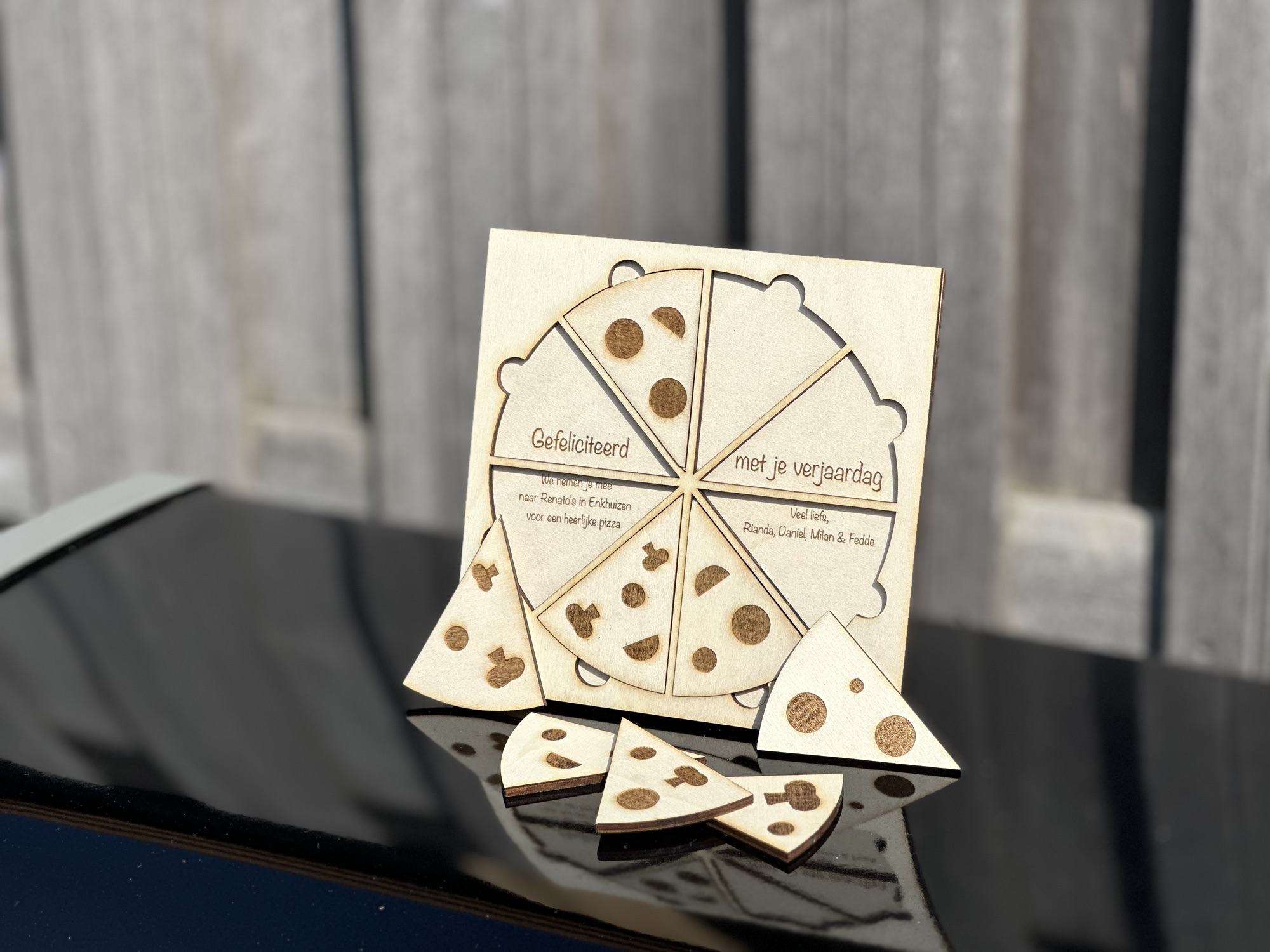 Origineel iemand een etentje cadeau doen met een houten cadeaubon. Bijvoorbeeld met de pizza puzzel. Achter de puzzelstukjes zit het cadeau verstopt waarbij je iedere tekst kunt aanleveren.