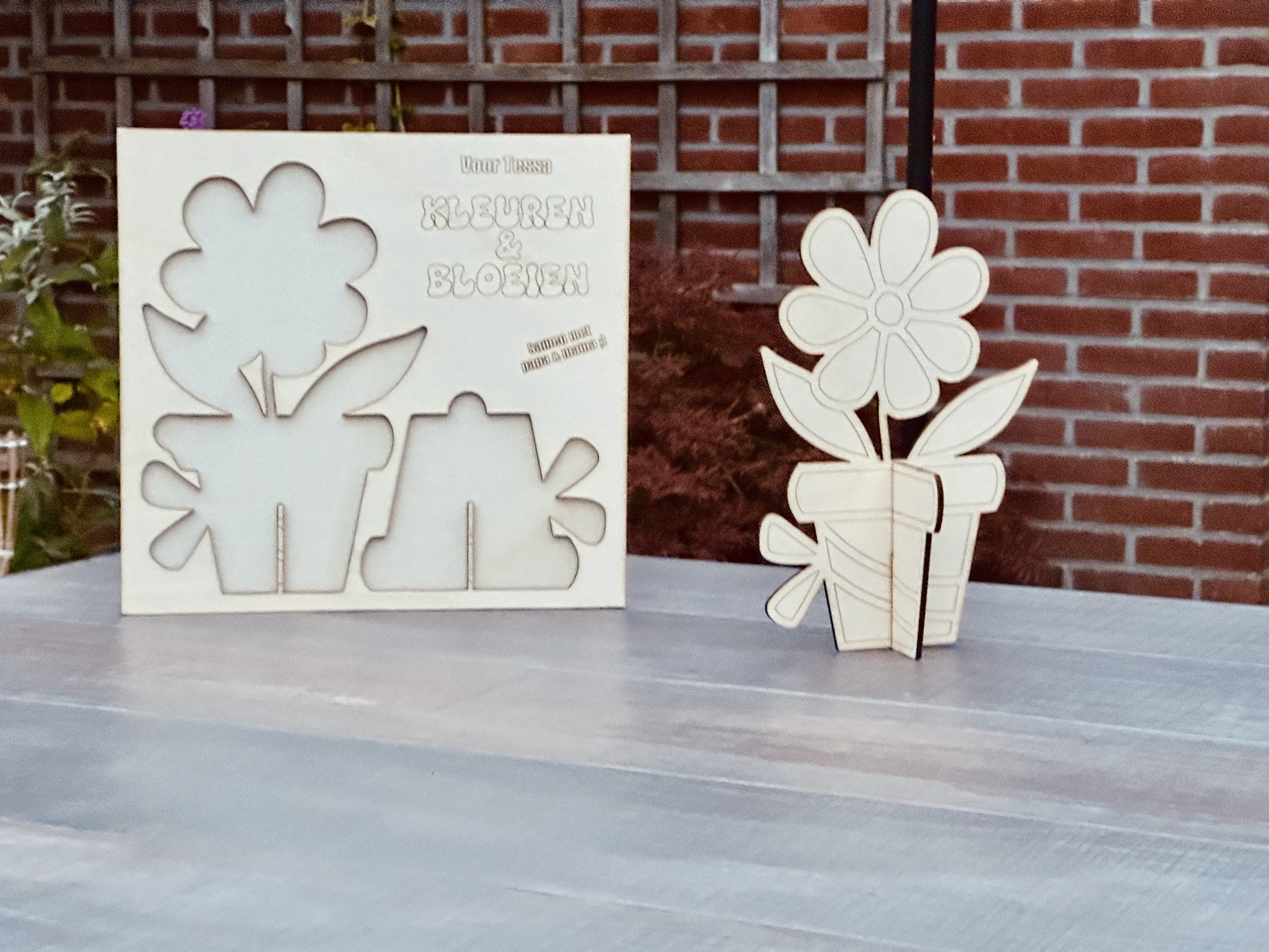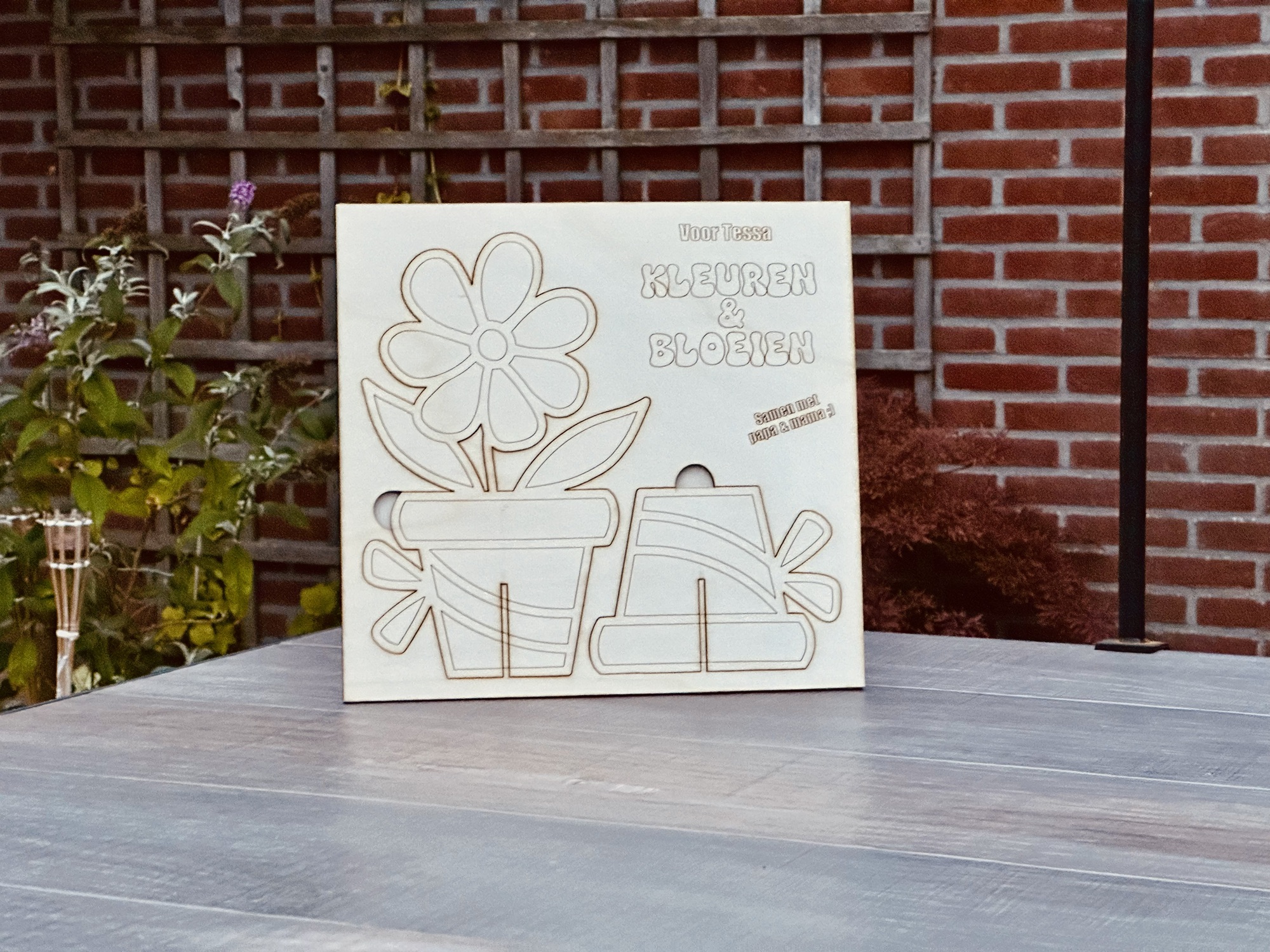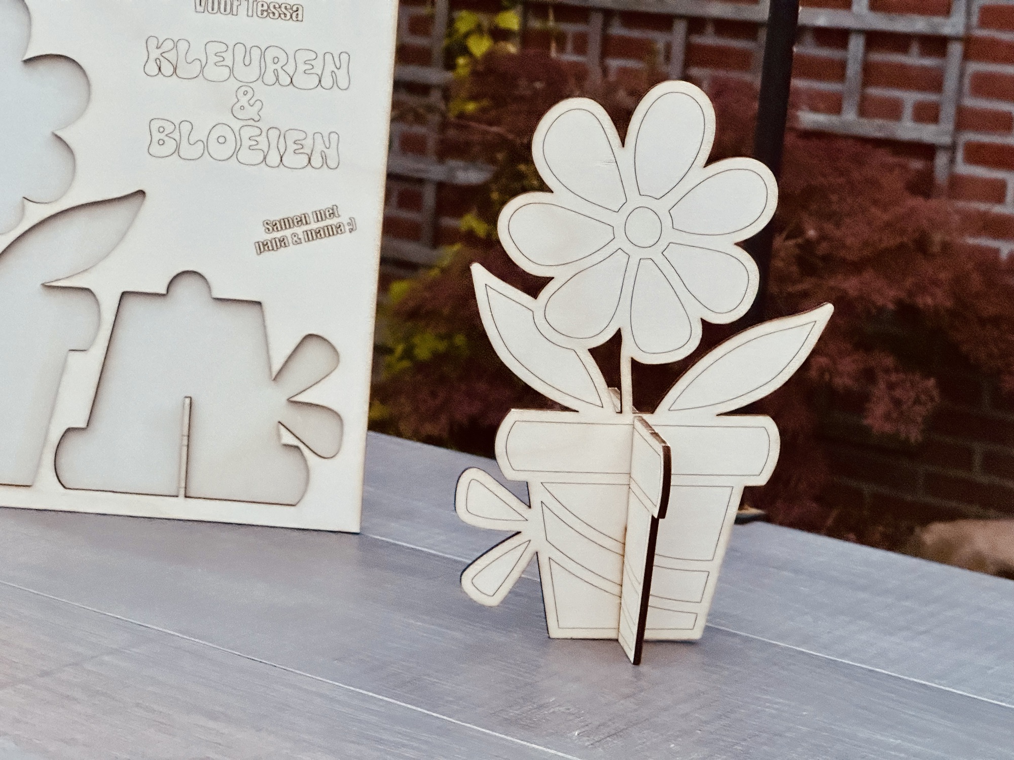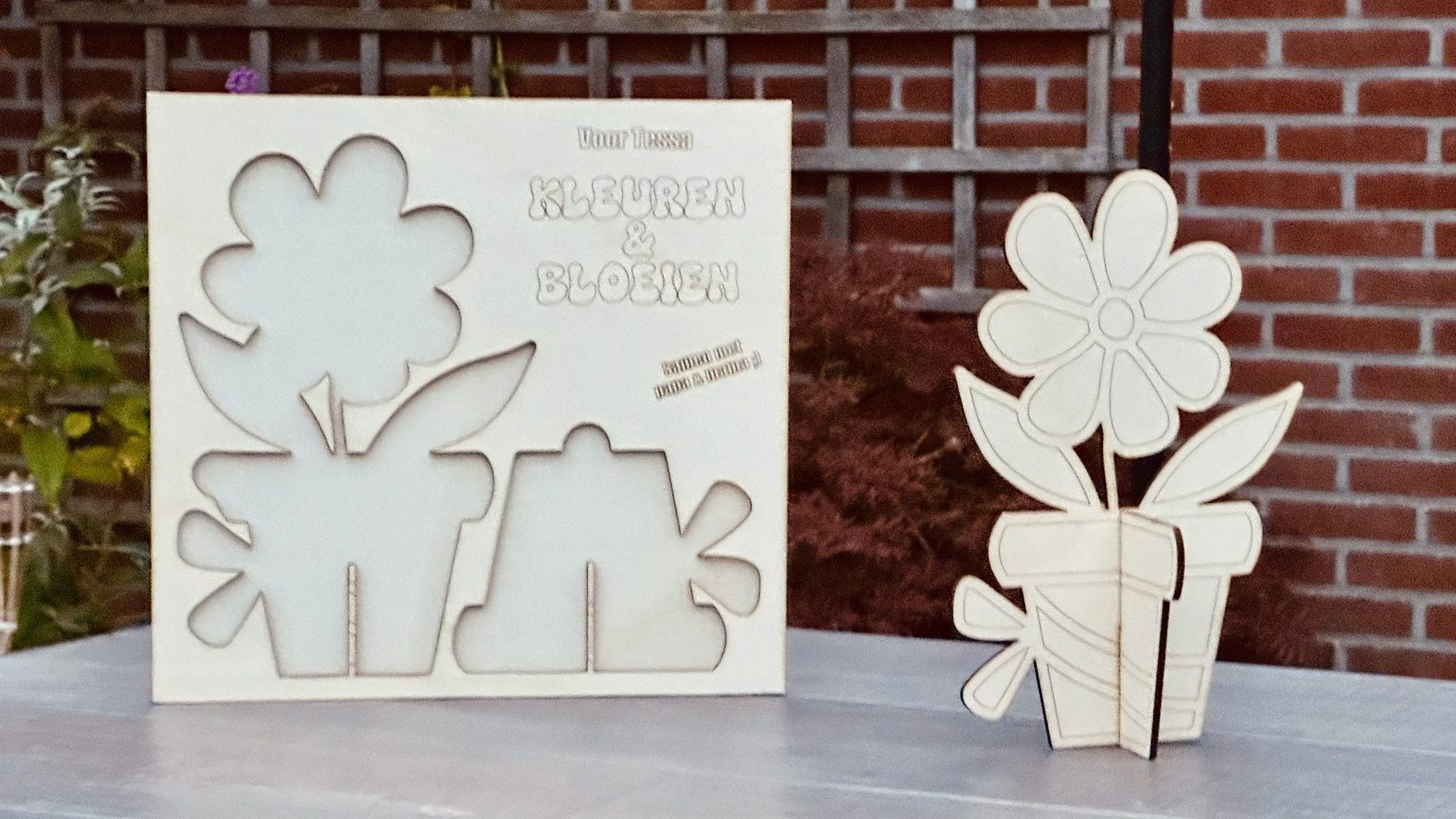 Kleur de bloem in en hij blijft altijd bloeien. Op de plaat (28 cm hoog en breed) kun je een eigen tekst zetten. Na het inkleuren zet je de bloem (25 cm hoog) in elkaar en blijft altijd staan.