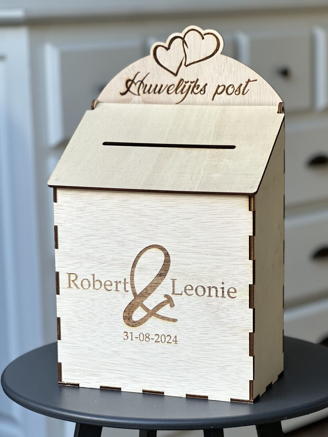 Een op maat gemaakte houten brievenbus! Perfect voor bruiloft met de namen van het bruidspaar, als ideeënbus of als “Post voor Sinterklaas”! Voor vele gelegenheden is er wel iets te maken.