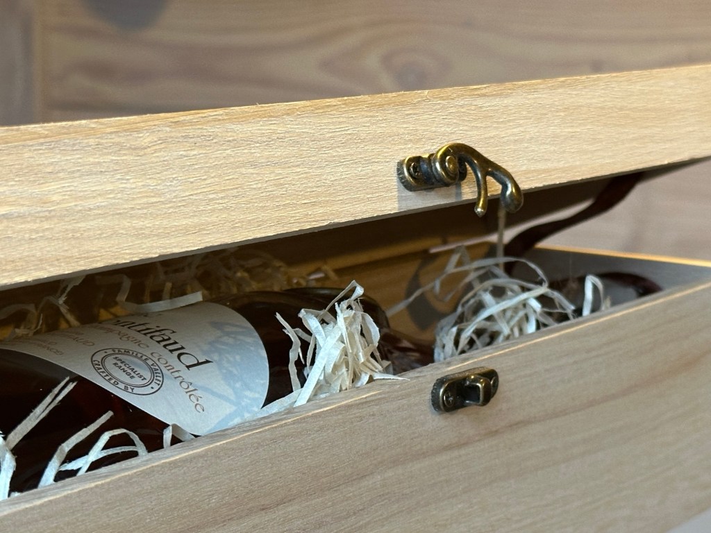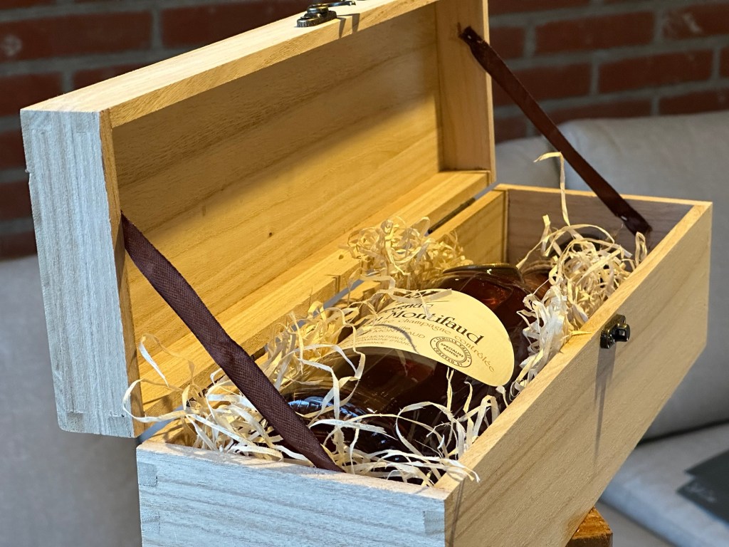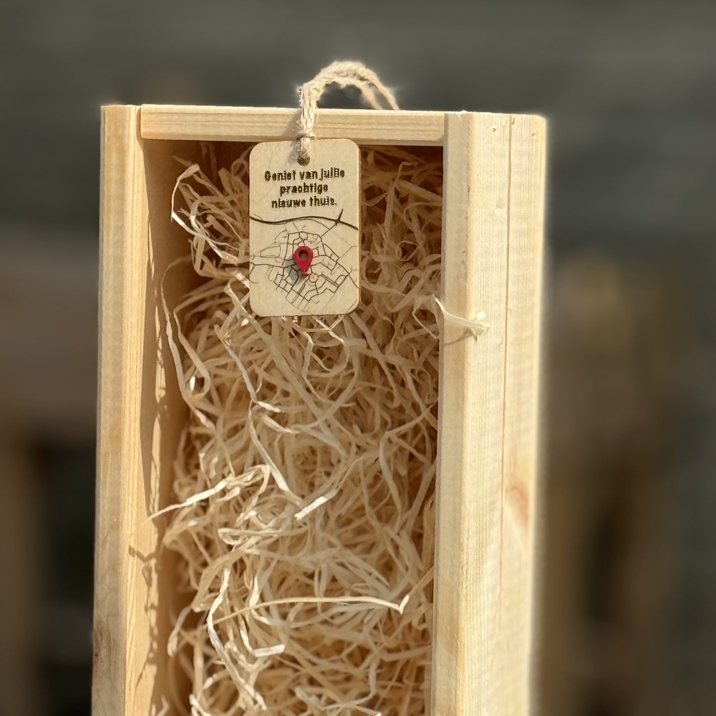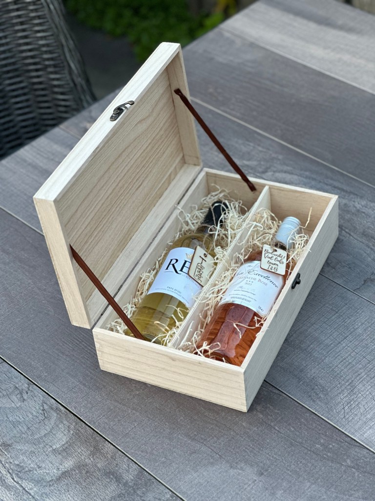 Het kistje wordt gevuld met houtwol en is exclusief wijn en eventuele verzendkosten.