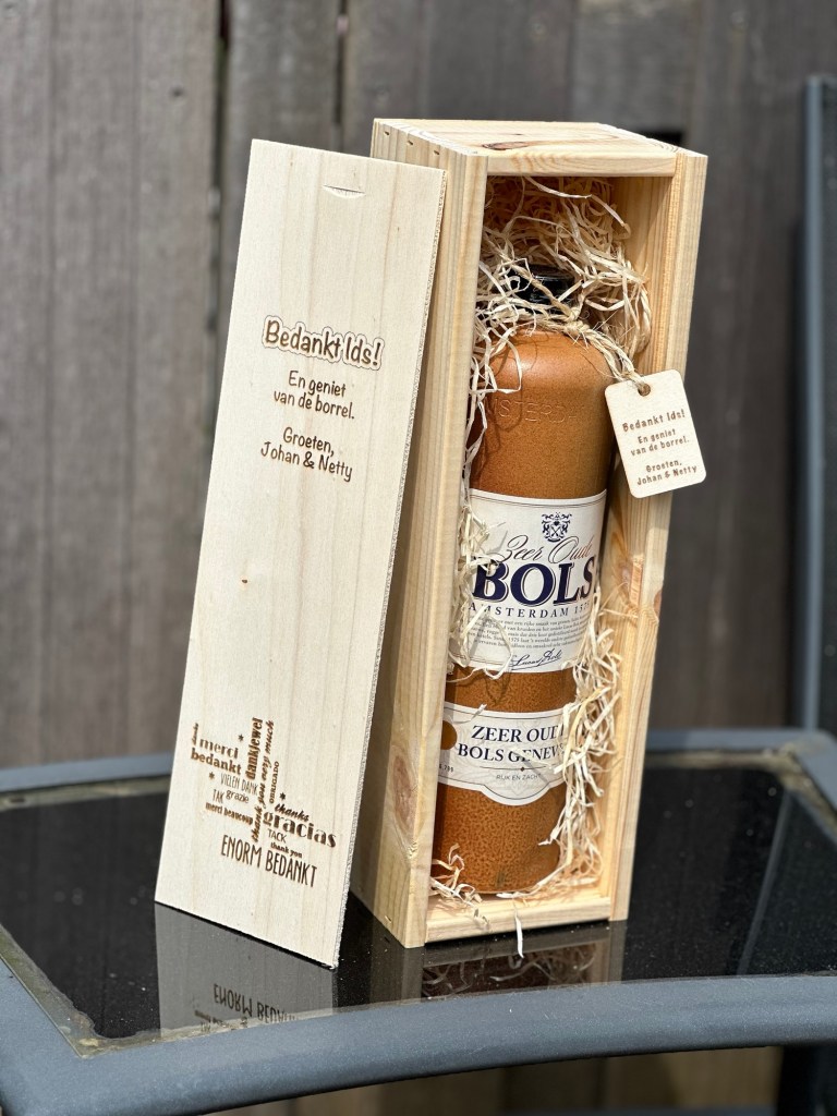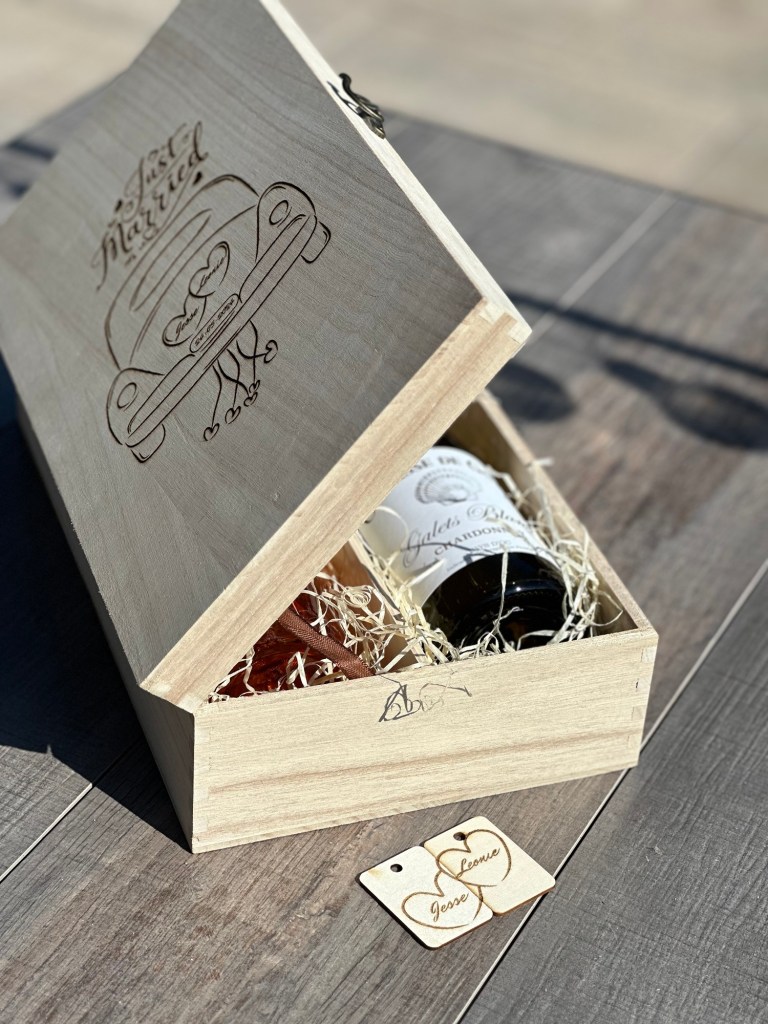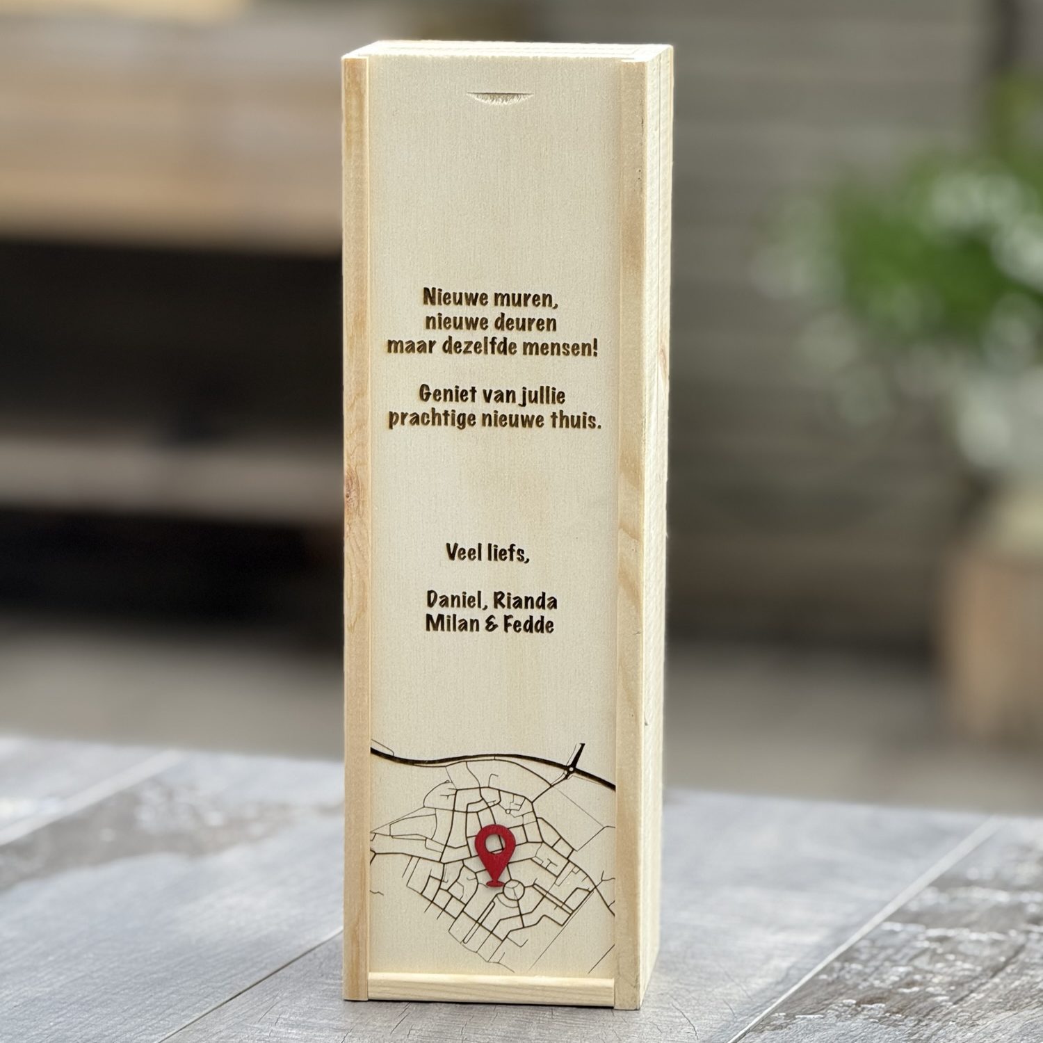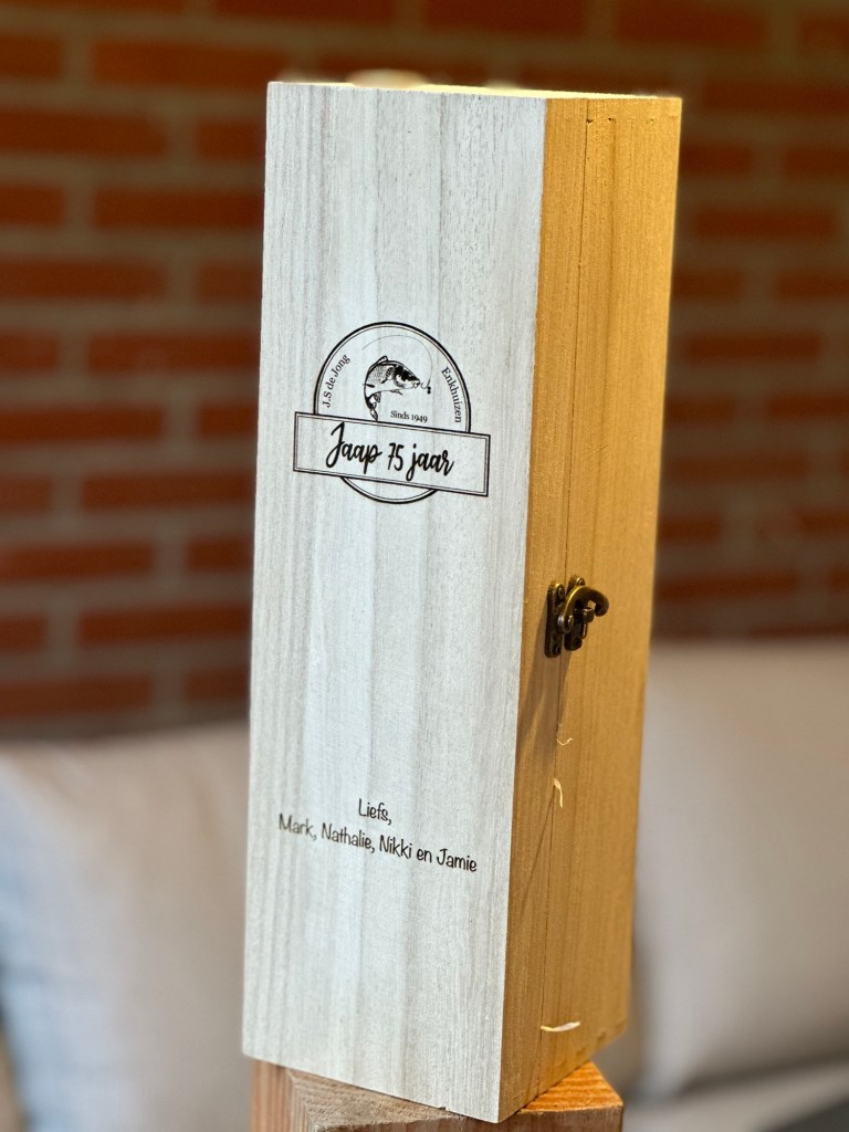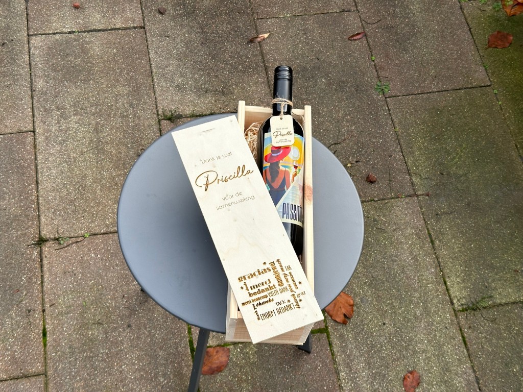 Deze standaard wijnkist is al een feest om te geven! Op de deksel komt het ontwerp zoals ik voor je maak of dat jij naar mij hebt gestuurd.