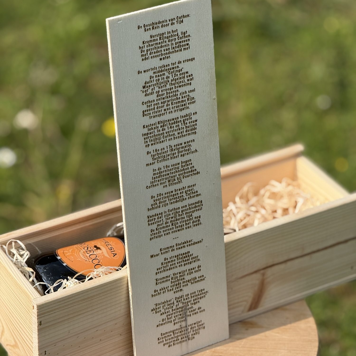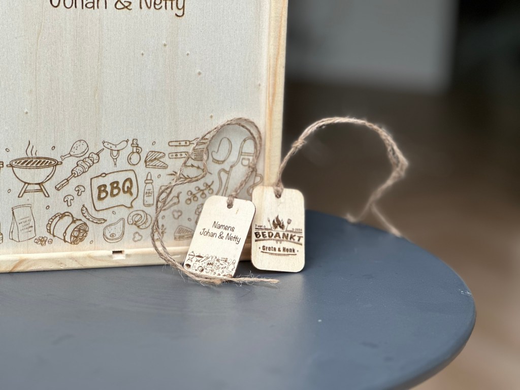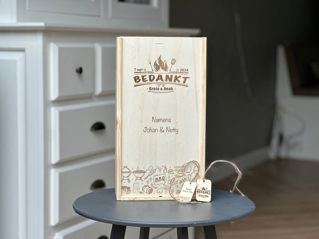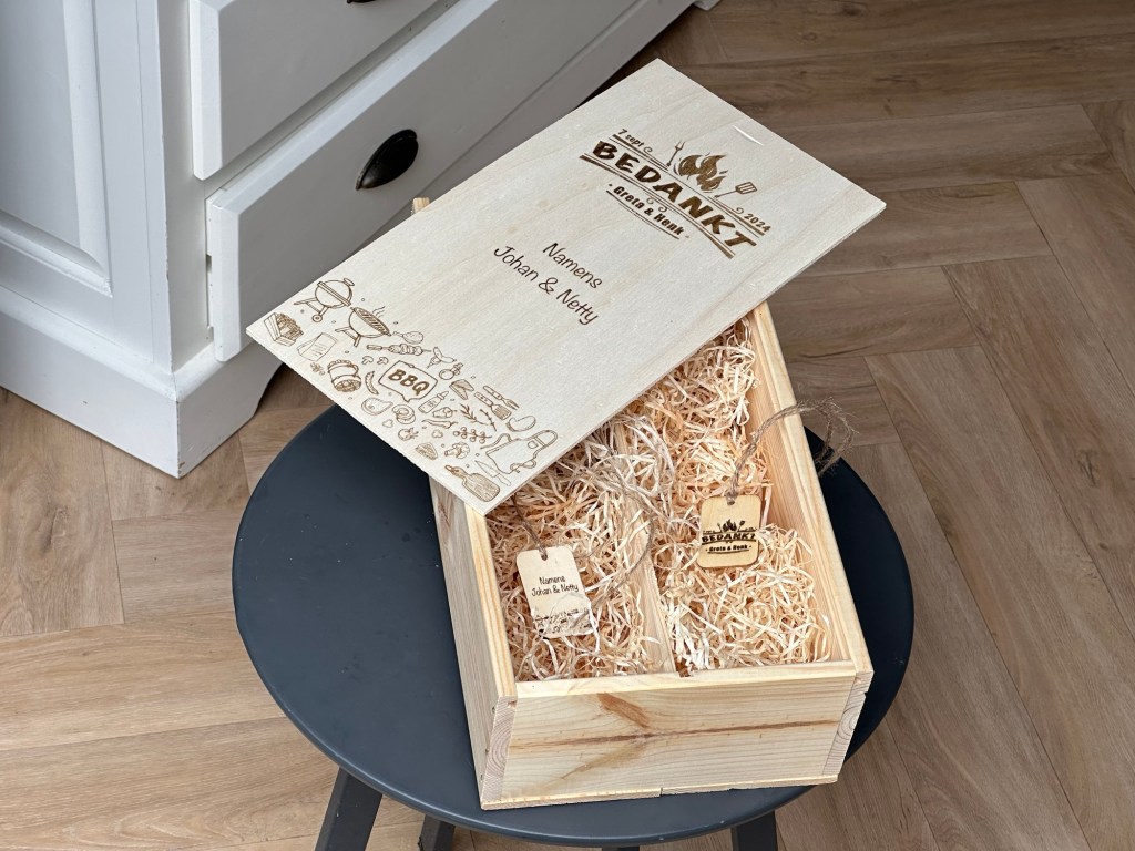 Op de deksel wordt jouw felicitatie, bedankje, logo of iets anders gebrand. Het ontwerp wordt voor je gemaakt maar je mag ook zelf iets aanleveren*.