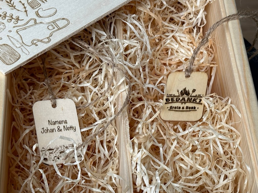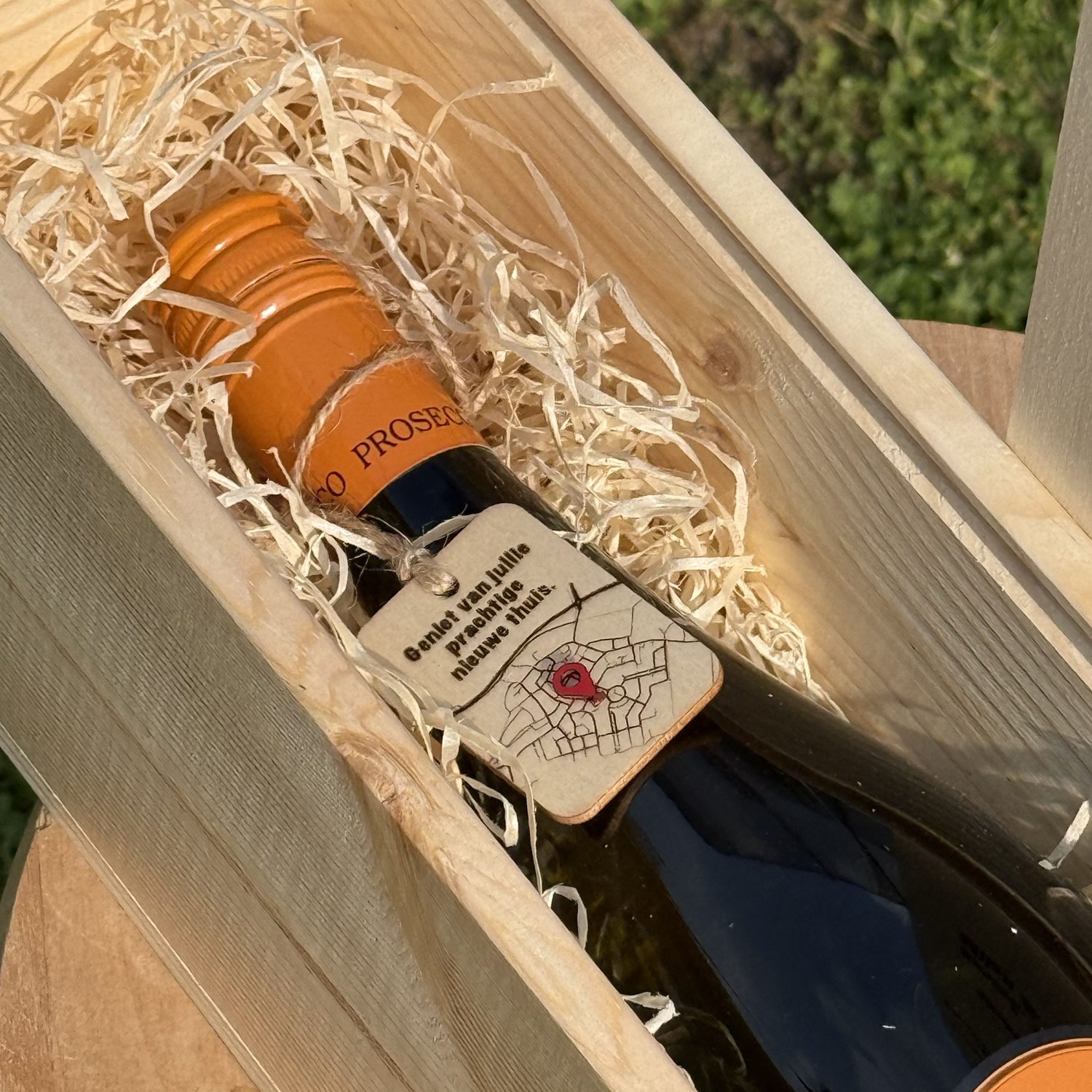En je krijgt er altijd zo’n leuke bijpassende houten cadeaulabel bij om aan de fles te hangen.