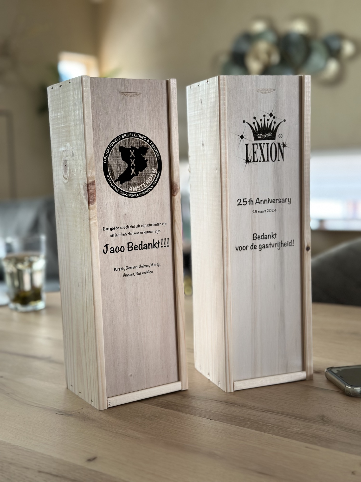 Leuk als je twee mensen wijn cadeau wil geven! Op de deksel is genoeg ruimte voor het ontwerp zoals ik voor je maak of dat jij naar mij hebt gestuurd.