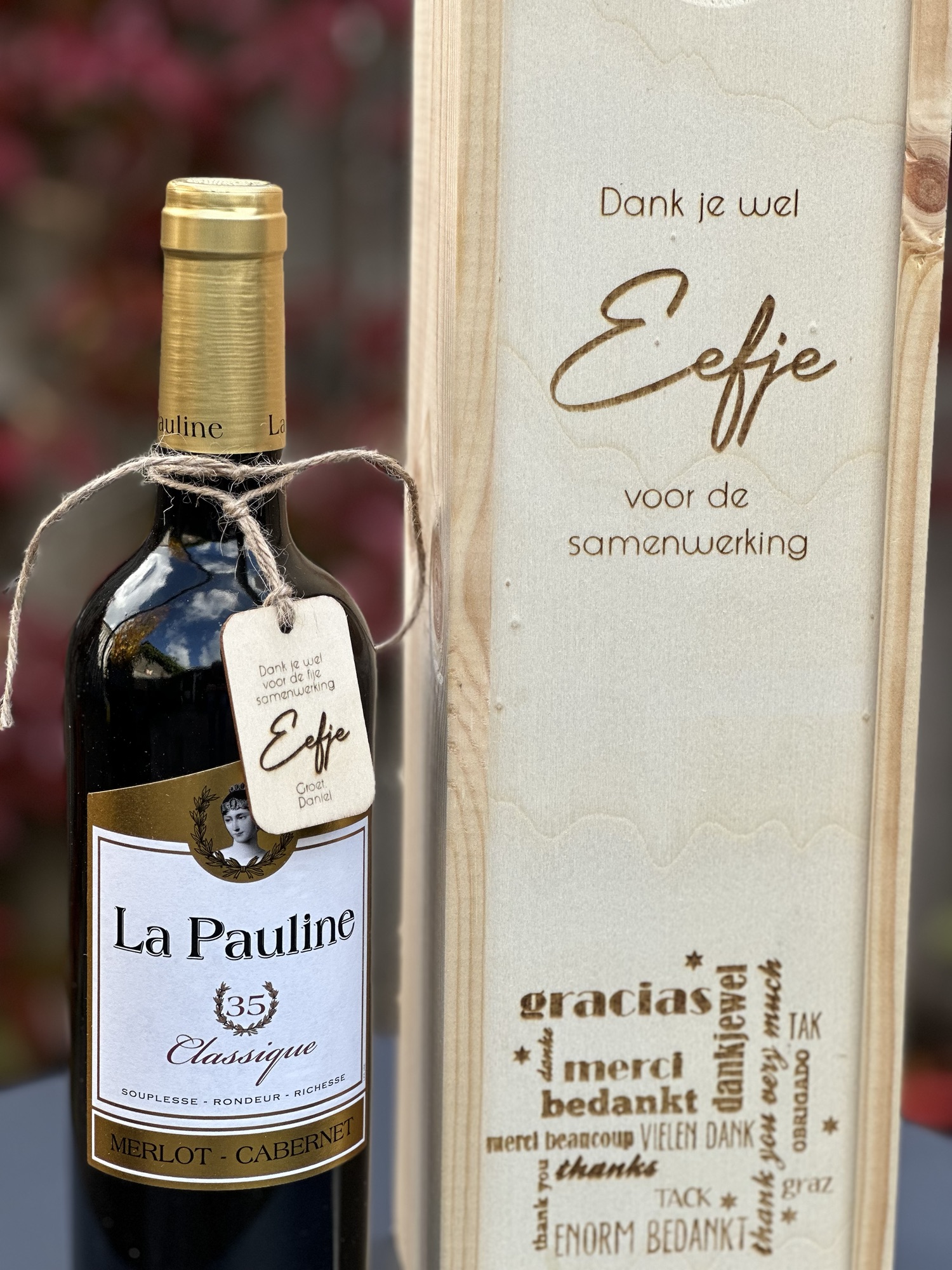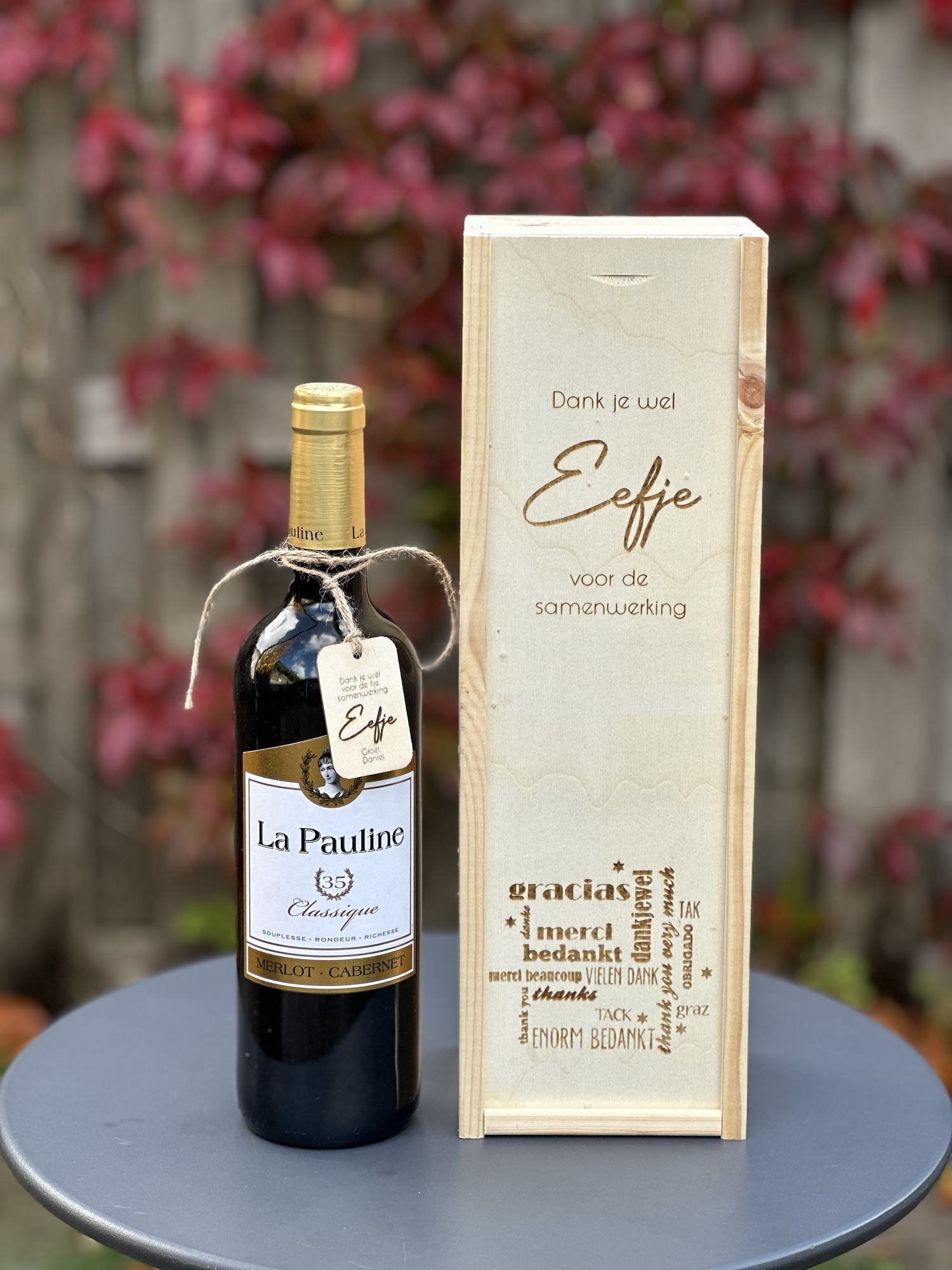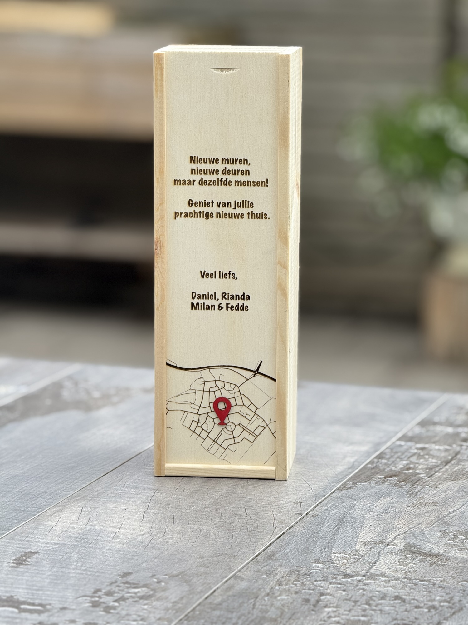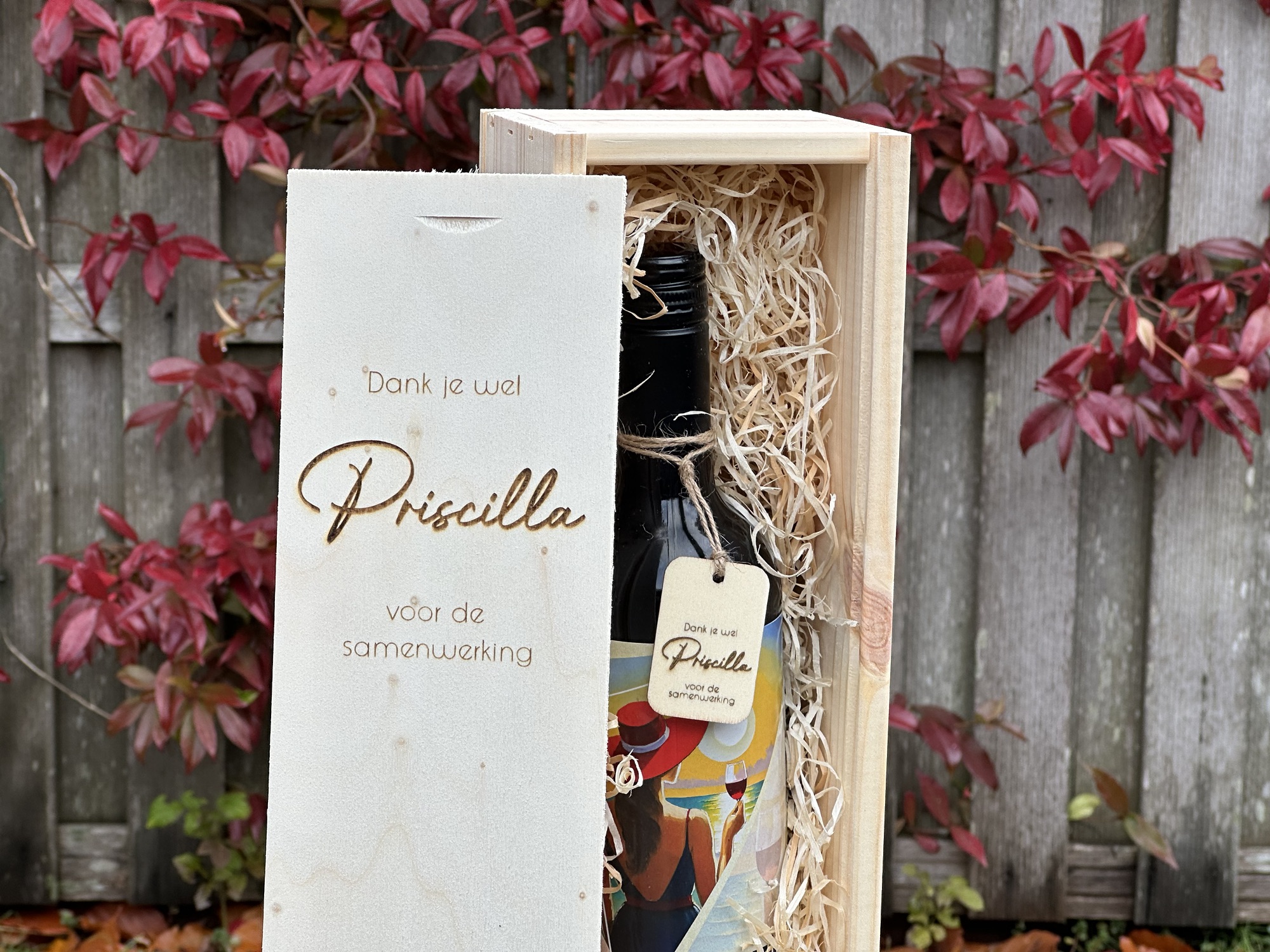 Deze standaard wijnkist is al een feest om te geven! Op de deksel komt het ontwerp zoals ik voor je maak of dat jij naar mij hebt gestuurd.