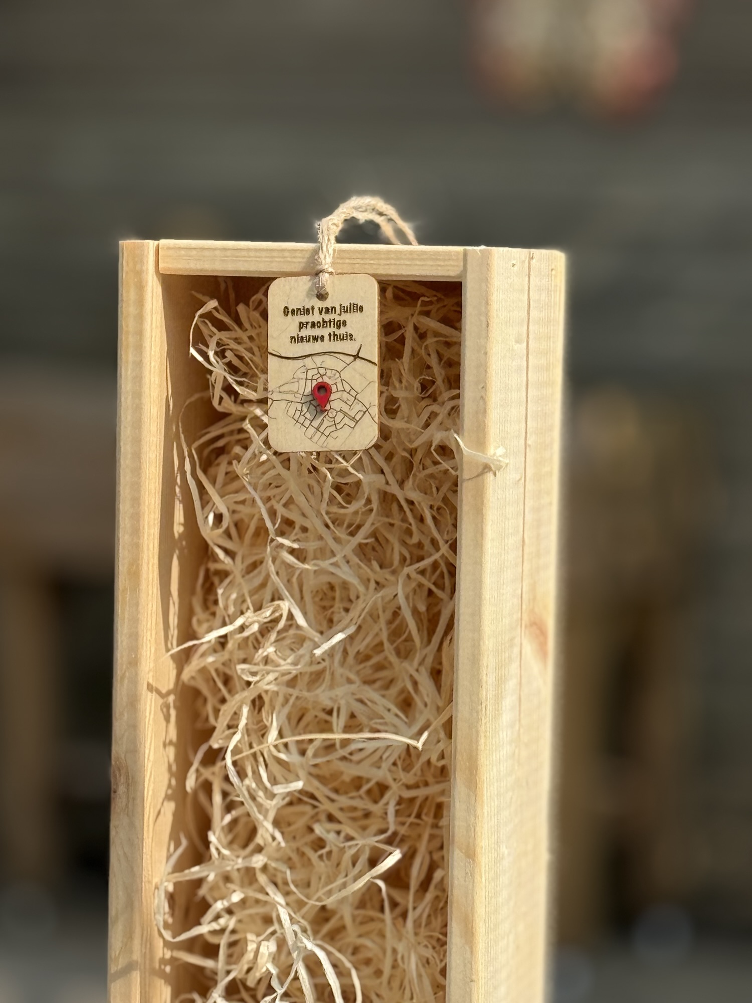 Het kistje wordt gevuld met houtwol en is exclusief wijn en eventuele verzendkosten.