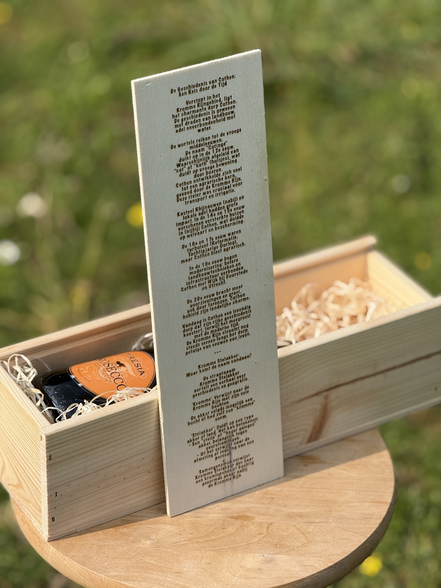 Op de deksel wordt jouw felicitatie, bedankje, logo of iets anders gebrand. Het ontwerp wordt voor je gemaakt maar je mag ook zelf iets aanleveren*.